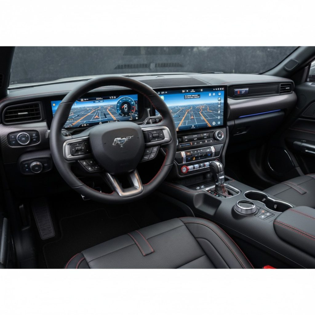 Ford has likely utilized the 12.4-inch digital instrument cluster and the massive 13.2-inch SYNC 4 touchscreen from the 2024 Mustang. The graphics are powered by the Unreal Engine 3D gaming engine, making the animations buttery smooth.