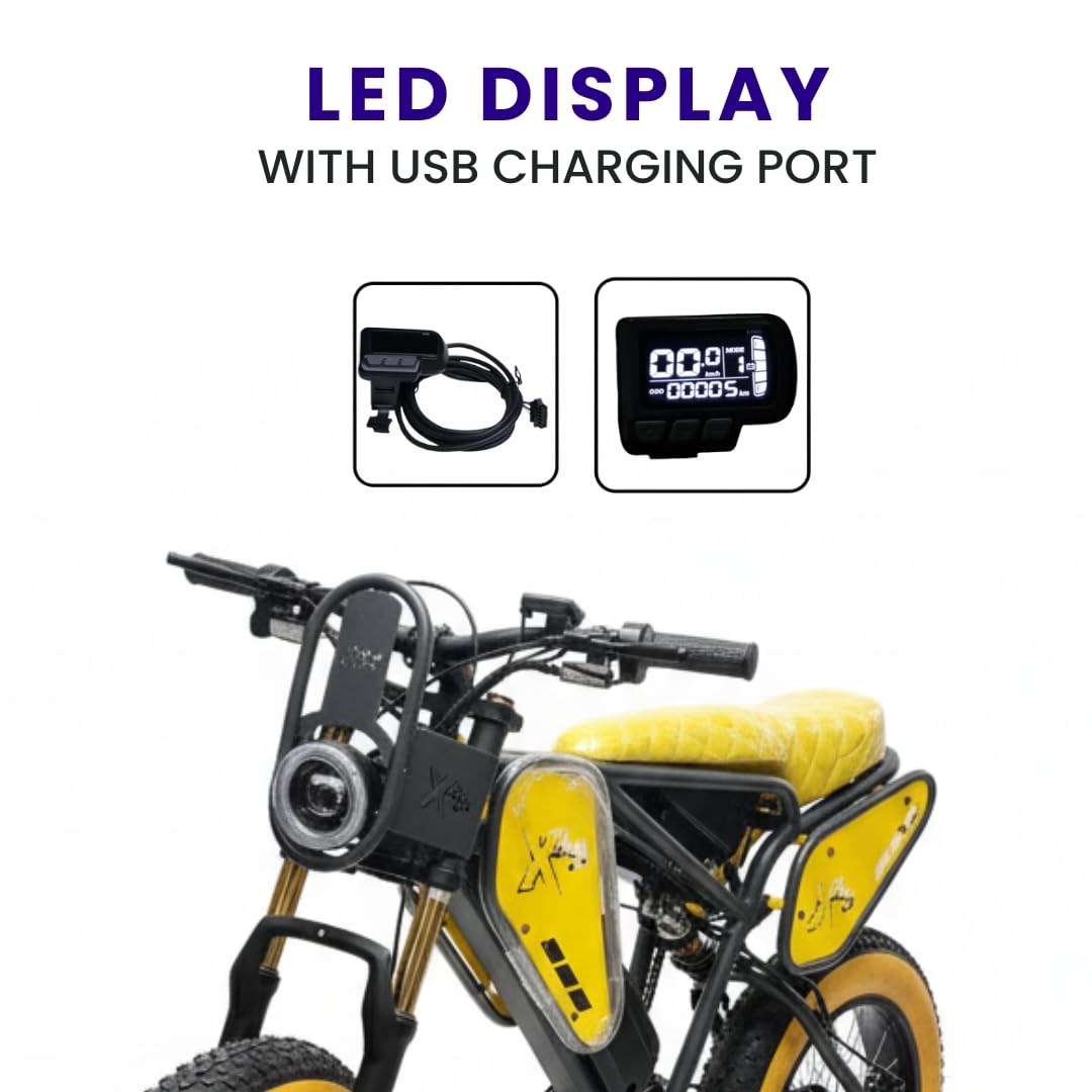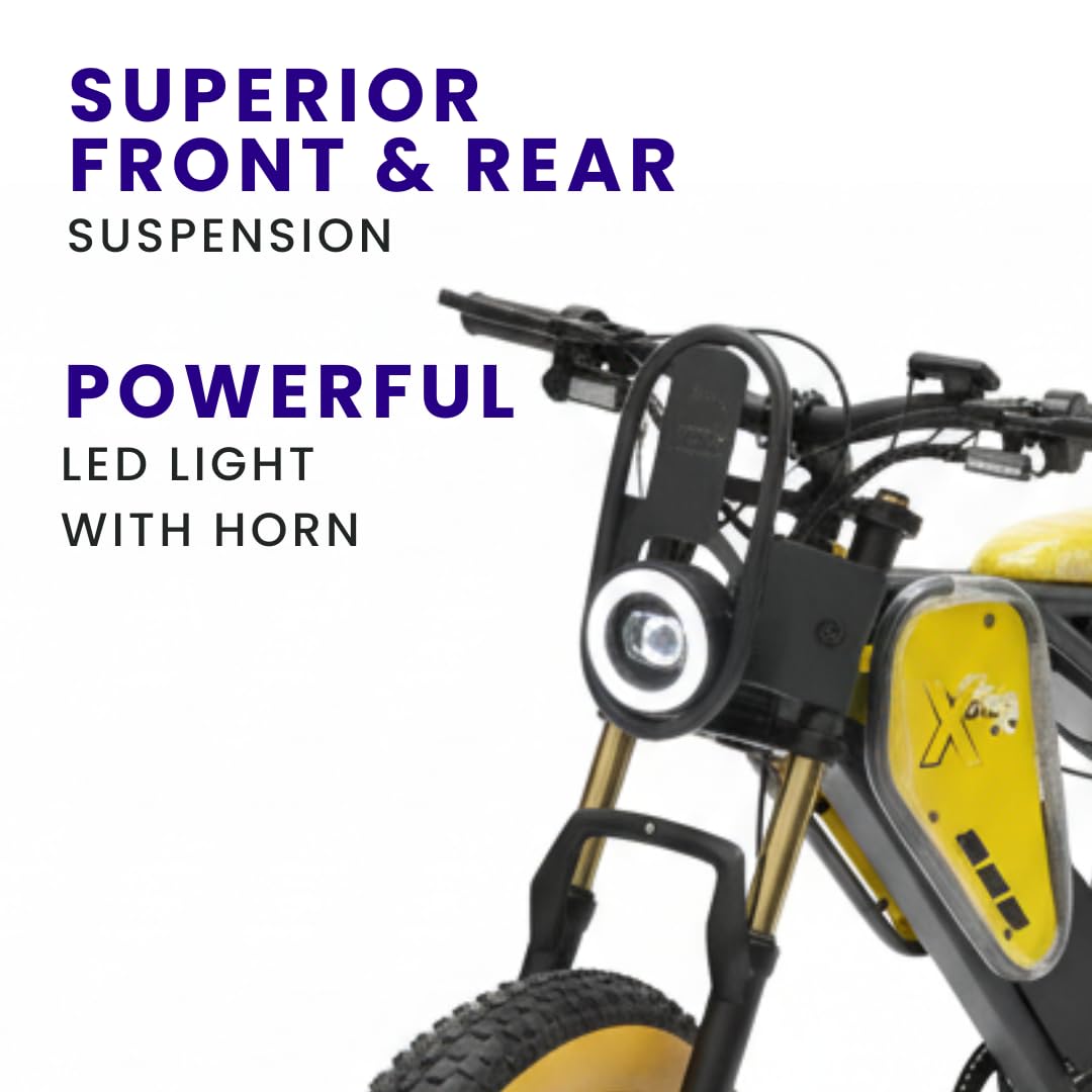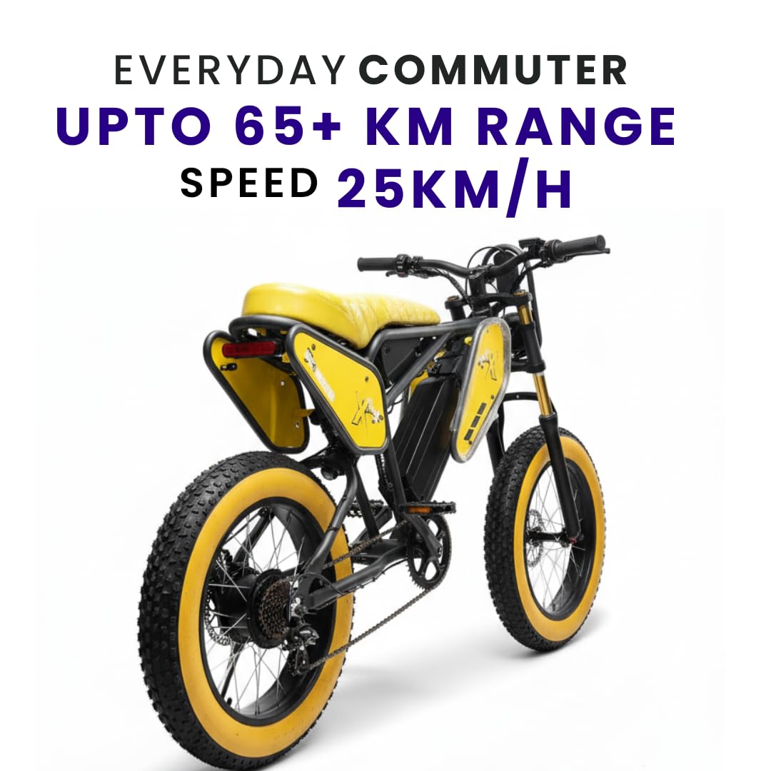 VigorEBike X45 Urban Electric Cycle Youth Series Electric Cycle | FAT Tyre Cycle 20.0” With Front Suspension | Dual Disc Cut-Off Brakes | Fast Charging| Up To 35 KM Range on Pas (Neon Green, Black) 48V, 350W BLDC Rear Hub Motor, Rated IP-65 | Top speed -25 kmph, Range: 65+ KM on Throttle 85+ KM on PAS, | Charging Time: 2-3 Hrs, Battery: 18.5Ah 48V Lithium-lon | Weight capacity 100-110 kg one person | 7-Speed Bicycle Gear Shifter is optional.